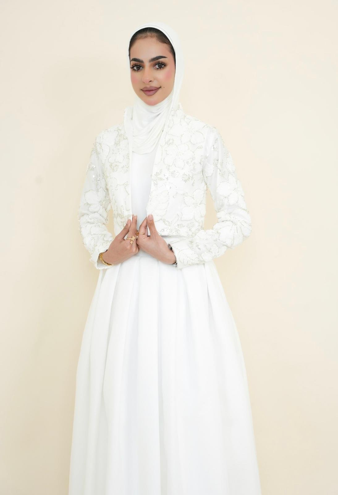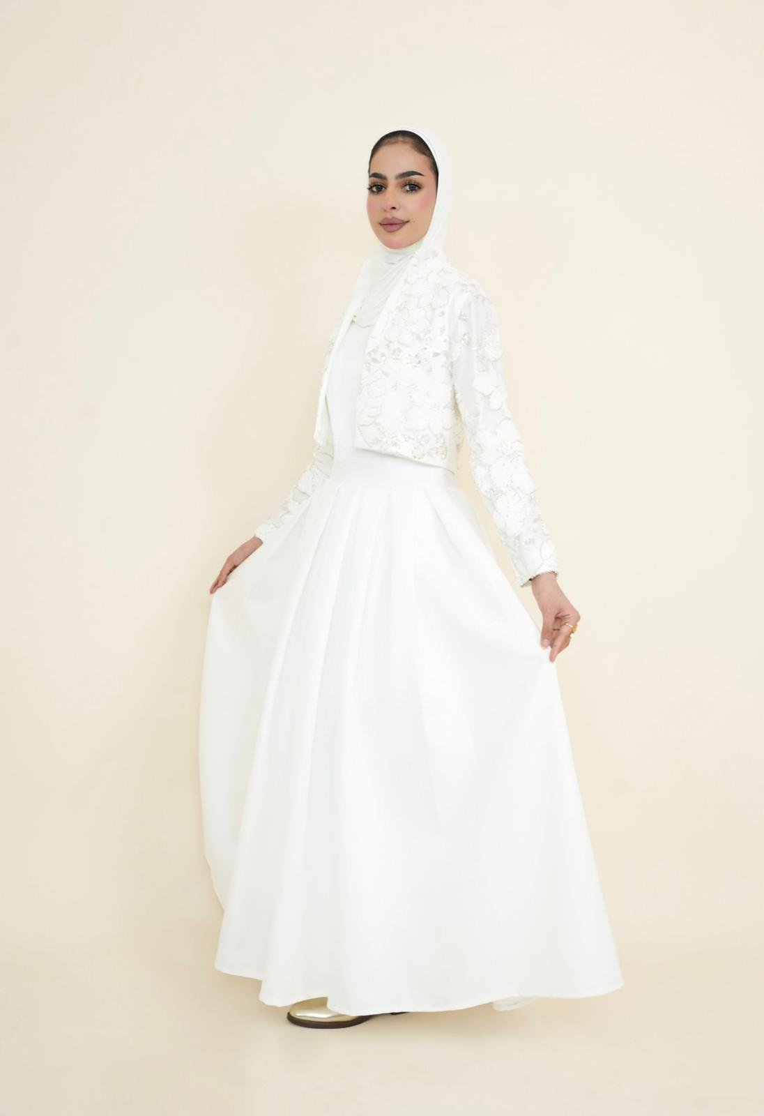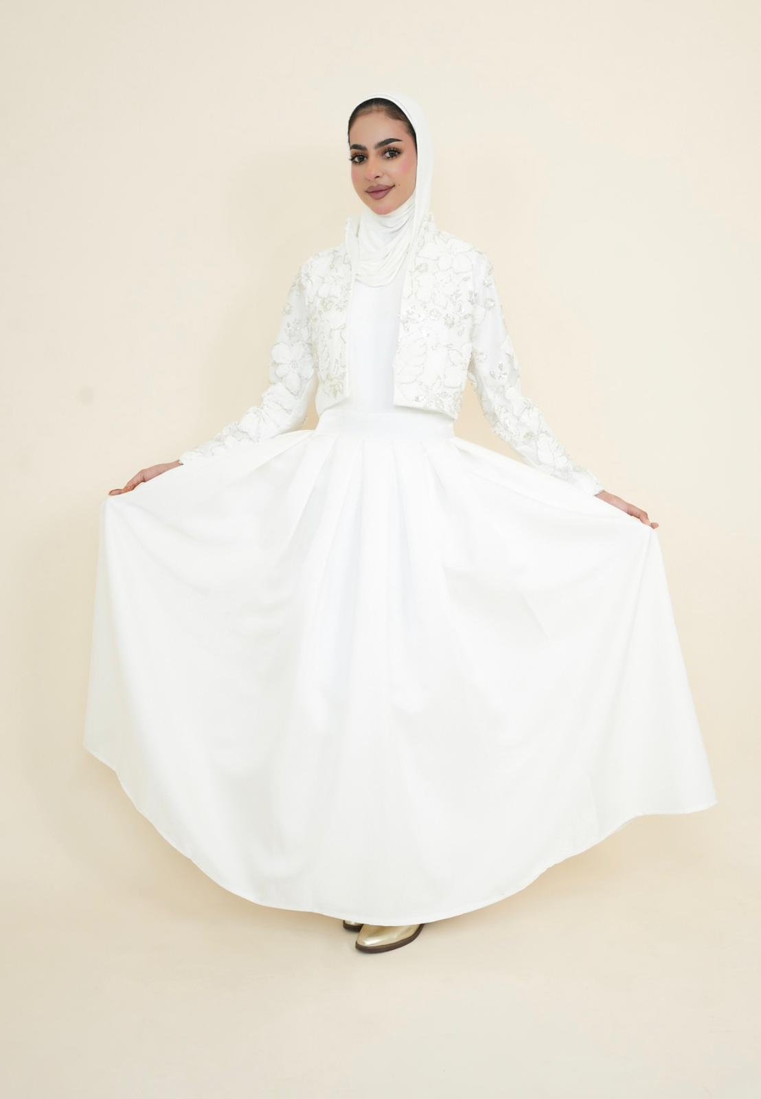فستان أبيض بتصميم نقي يعكس الهدوء والرقي، مع جاكيت دانتيل فاخر يضيف لمسة فخمة وأنثوية. مثالي للمناسبات الخاصة والإطلالات الراقية.